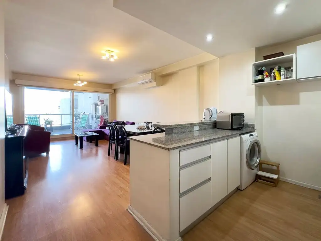 Living comedor con cocina integrada, y espacio para lavarropas generando un ambiente amplio y moderno.