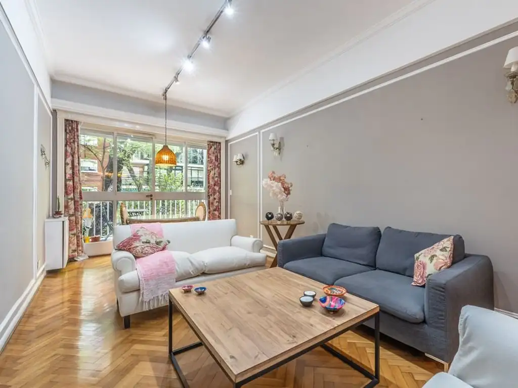 Semipiso al frente. Tradicional edificio "Los Árboles" construido por Barugel Azulay, 60 años de antigüedad. Impecable.5 ambientes con dependencia: 3 dormitorios, comedor, living independiente, cocina-comedor diario, dependencia de servicio o cuarto dormitorio con baño y ducha.Baño principal y toilette.Patio.Palier semi-privado. Entrada, ascensor y escalera de servicio. Gran baulera. Balcón. Porcentaje de propiedad sobre el local comercial.Doble circulación.Pisos de parquet, yesería y marquetería original; 100% restaurado. Ventanas con persianas de madera a motor. Bibliotecas empotradas. Instalación eléctrica nueva por fases. Calefacción y agua caliente central. TV - internet - WiFi y timbre por conexión interna en cada ambiente. Aberturas electrónicas en el ingreso al edificio, cámara de seguridad y alarma monitoreada Prosegur.Cocina a nuevo con despensa. Lavadero integrado, entrada independiente.Dormitorios con amplios placares y placard extra en hall íntimo de 3 puertas con bauleras.Baños a nuevo, grifería y sanitarios Rocca, pisos porcelanato italiano. Bañera original en el baño principal. Ducha en toilette y baño de servicio.Incluye artefactos de iluminación, arañas y aire acondicionado en uno de los cuartos.Opcional: parte del mobiliario.Se permiten mascotas.No apto profesional.