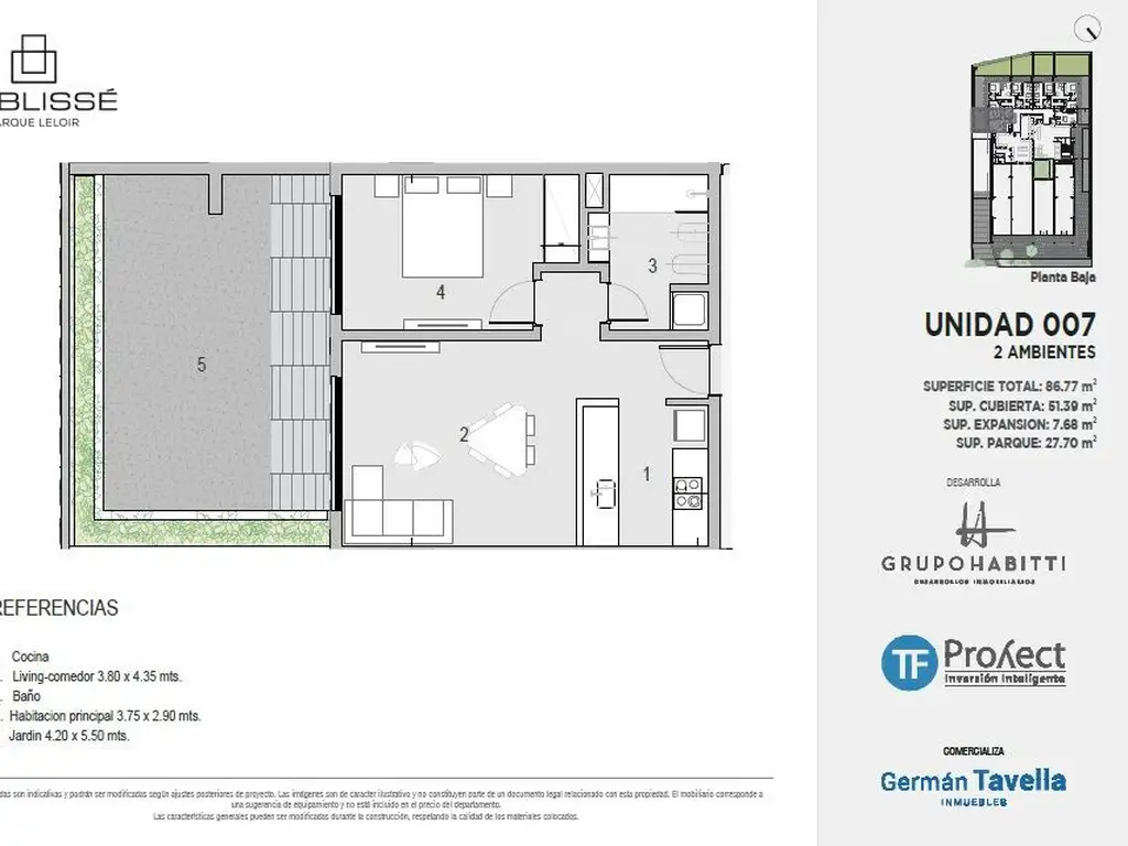 Unidad de 86,77 m2 totales; ubicado en planta baja, con jardín.