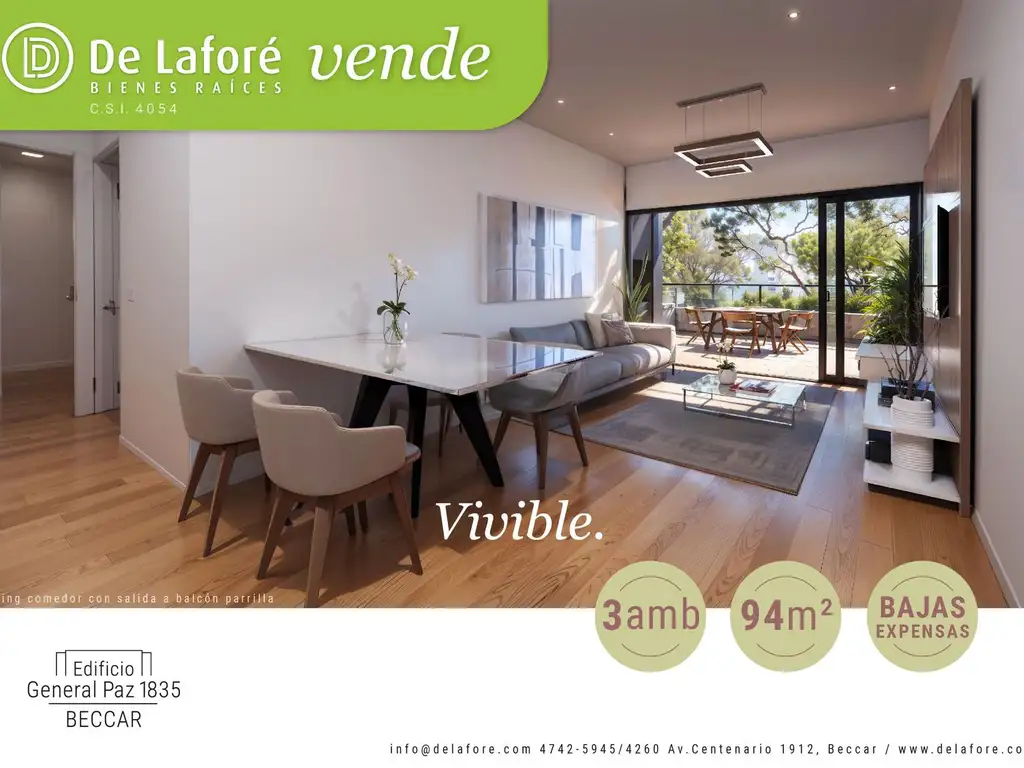 Este departamento de 3 ambientes contrafrente en General Paz 1835 ofrece una excelente distribución y terminaciones de primera calidad, a estrenar, en pleno Beccar.