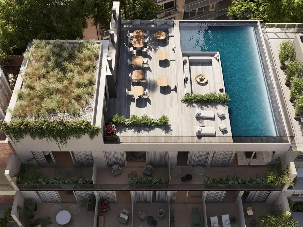 La terraza se transforma en un verdadero punto de encuentro, con pileta de borde infinito, solárium, sector de fogonero y quincho parrillero. Ideal para disfrutar del aire libre, relajarse o socializar.
