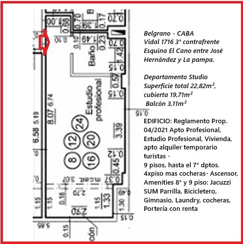 Superficie total 22,82m², cubierta 19,71m² Balcón 3,11m² (ver plano en fotos)