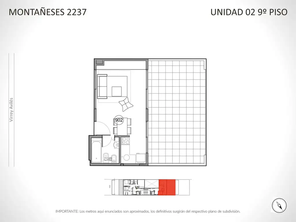 Ambiente super luminoso con grandes ventanales, placar con frente e interiores completos, y salida a amplio balcón terraza de 29,34 m2. Cocina americana con mueble bajo mesada y alacenas. Baño completo. Equipo de aire acondicionado tipo Split Frío/Calor instalado. Pisos de porcelanato. Entrada electrónica al edificio con Face ID.