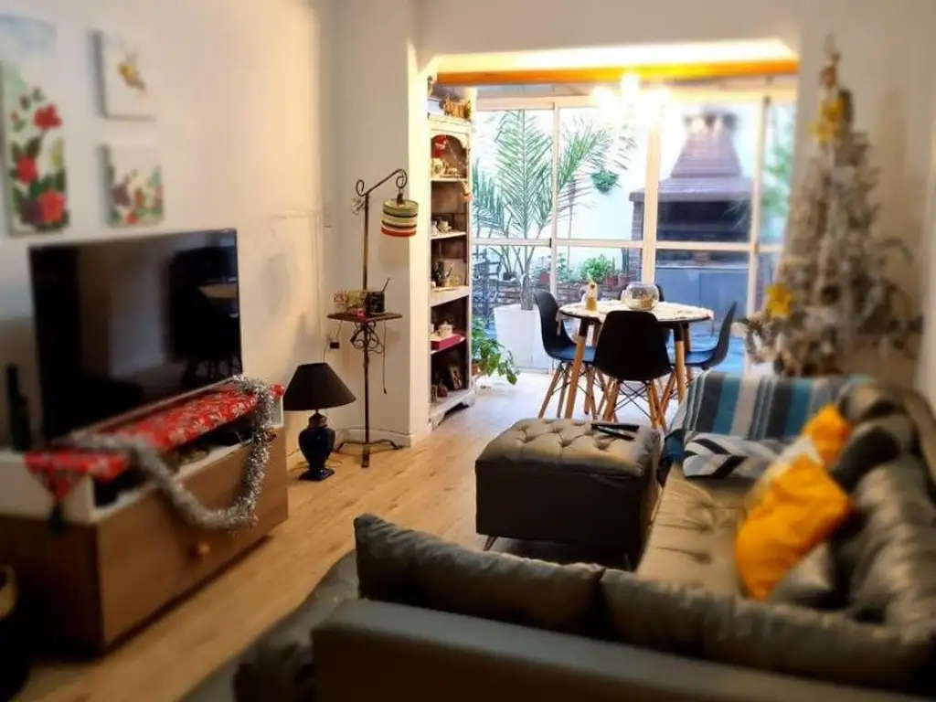 El departamento esta ubicado en planta baja, es amplio y luminoso, cuenta con un ventanal en el living con salida hacia un patio de 8 x 5 metros con parrilla, que recibe muy buena luz del sol por la mañana. Tiene un segundo patio interno cubierto. La cocina está completamente amoblada con alacena y bajo mesada, y una isla. El living comedor cuenta con un hogar a gas, y un aire acondicionado frío/calor nuevo. Dos dormitorios luminosos, con placards empotrados, uno de ellos con aire acondicionado frío/calor. Baño hecho a nuevo, completo con bañera.
