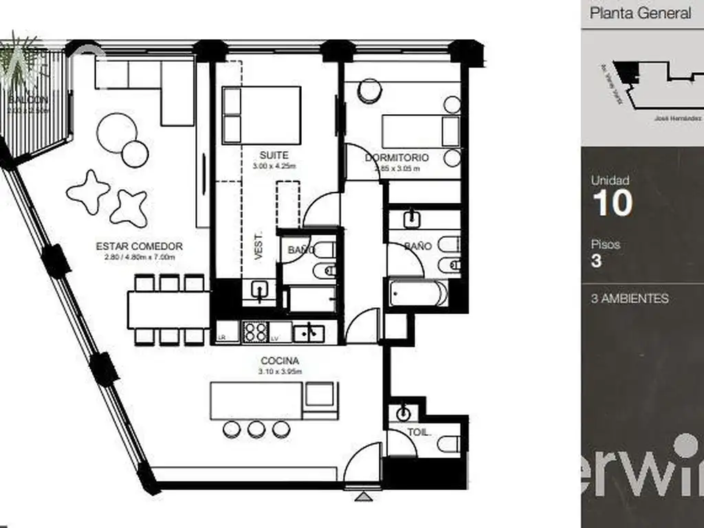 Espectacular 3 ambientes ubicado al contrafrente con amplios ventanales y vistas sobre Virrey Vertiz. Living comedor con salida a balcón sobre esquina, cocina integrada y toilette de recepción. Dormitorio principal en suite, segundo dormitorio y baño completo.