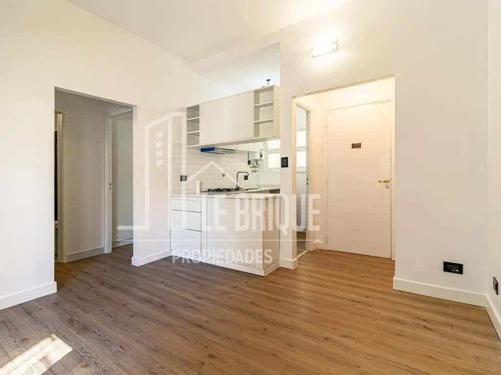 Cómodo living comedor con balcón francés, aire acondicionado Split, cocina semi-integrada con ventilación al exterior, equipada con horno empotrado, anafe de cuatro hornallas a gas, extractor, mesada de cuarzo, bajo mesada y alacena. Calefón a gas. Espacio de guardado/placard en hall de entrada. 2 dormitorios ambos con placard incorporado, buena ventilación natural y aire acondicionado split frio-calor