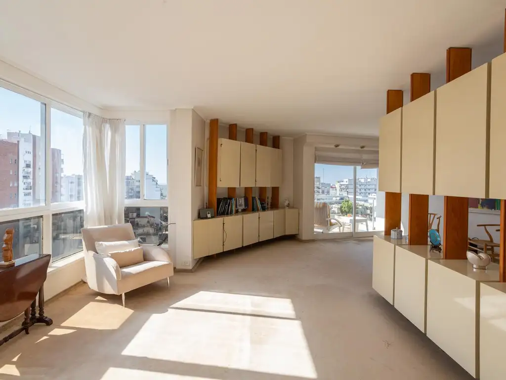 Ingresando por ascensor principal se accede a un palier privado que conduce a un amplio living comedor rodeado de ventanales perimetrales, lo que lo hace especialmente luminoso y cálido. Desde allí se accede a un balcón aterrazado con vista abierta al río. El ambiente se completa con un baño de recepción.