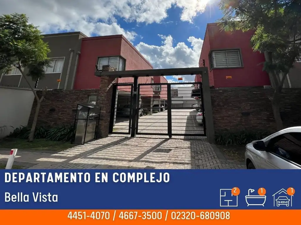 DEPARTAMENTO DOS AMBIENTES EN PLANTA ALTA CON ACCESO POR ESCALERA, CON LIVING COMEDOR, COCINA INTEGRADA CON BAJO MESADA Y ALACENA, INSTALACIÓN PARA LAVARROPAS, BAÑO COMPLETO CON BAÑERA, UN DORMITORIO LUMINOSO Y COCHERA SEMI-CUBIERTA.