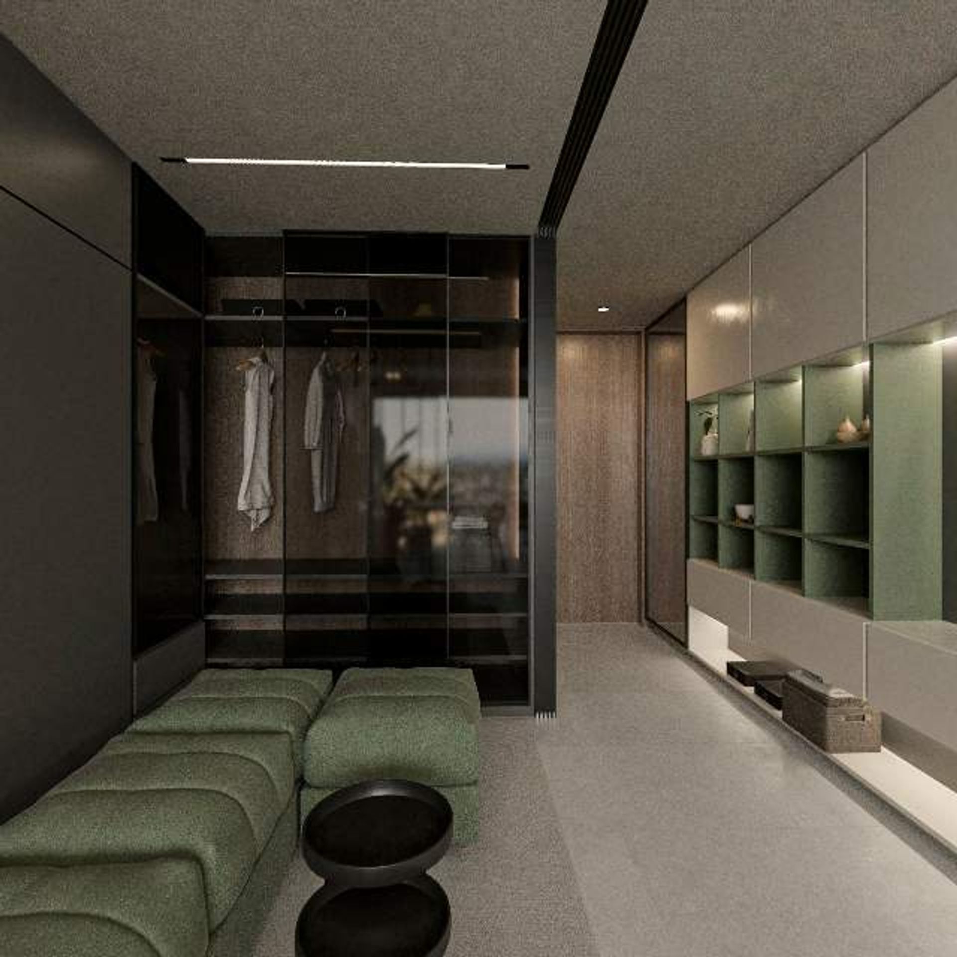 El dormitorio optimiza el espacio con mobiliario integrado, mientras que el baño se presenta con mampara de vidrio laminado y columna de ducha multifunción.