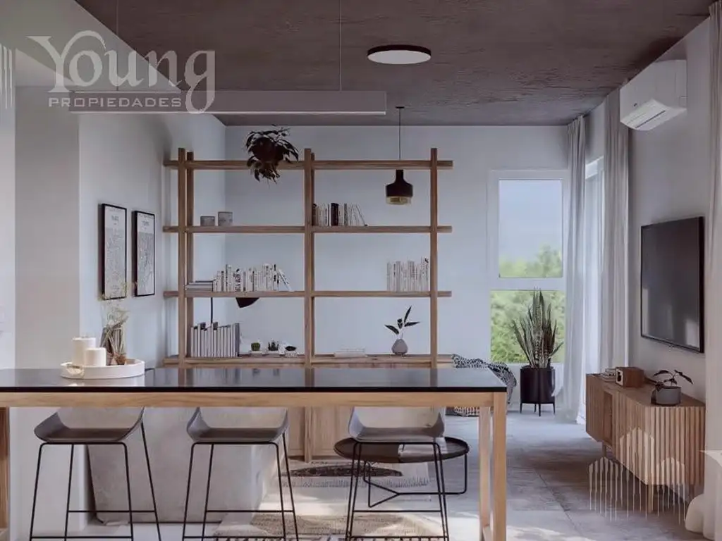 Se ingresa a un amplio living comedor, cocina semintegrada con barra desayunadora, muebles de bajo y sobre mesada de granito negro brasil. La unidad cuenta con anafe vitroceramico, cocina empotrada y termo eléctrico.