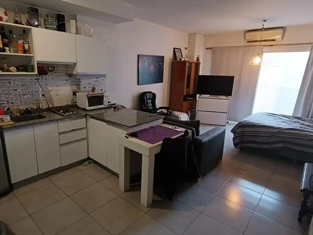 Es un monoambiente con cocina integrada ,un baño y un balcon.