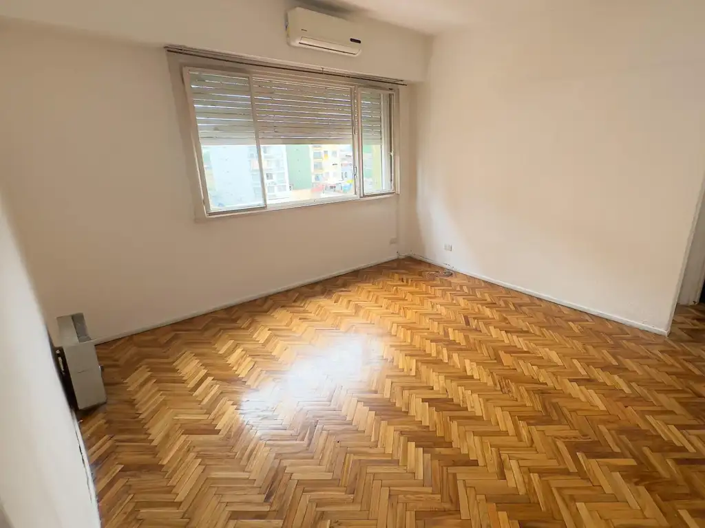 Departamento dos ambientes, sobre 36 metros totales aproximados, living y dormitorio con pisos de parquet (en buen estado general) y aberturas, haciendo de estos, ambientes luminosos y ventilados, el living cuenta tambien con pico de gas y aire acondicionado. Baño completo y cocina amplia y luminosa con espacio para heladera.