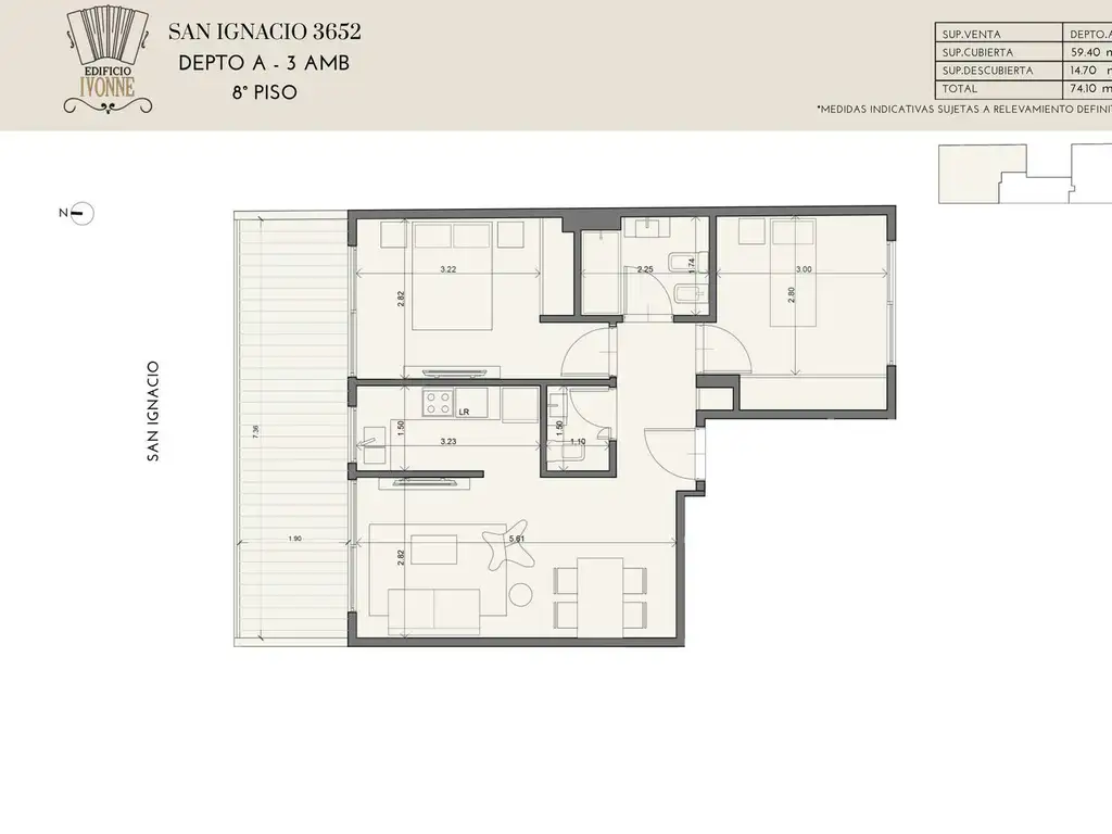 Departamento de 3 ambientes al frente con balcón, orientación Norte.