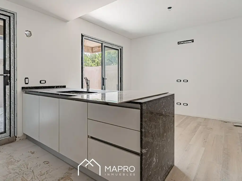 - Cocina completa integrada al living con alacenas, muebles bajo mesada, instalación para lavarropas y preinstalación de campana con salida al exterior