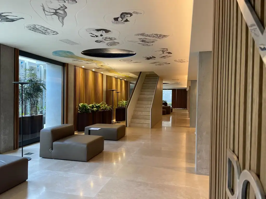 Cuatro (4) ascensores principales y uno (1) de servicio. Puertas automáticas. Cabina con zócalos, pasamanos y cielorraso en acero inoxidable. Espejo. Piso de mármol o granito.