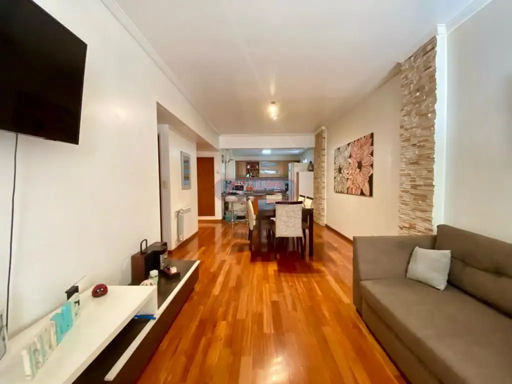 Se ingresa al living comedor con pisos de parquet con cocina incorporada al ambiente con muebles bajo y sobre mesada de 6x4 mts.Toilete de recepción.Dos dormitorio al frente de3x3 mts con placard empotrado. Baño completo. Balcon aterrazado de 8x2 mt