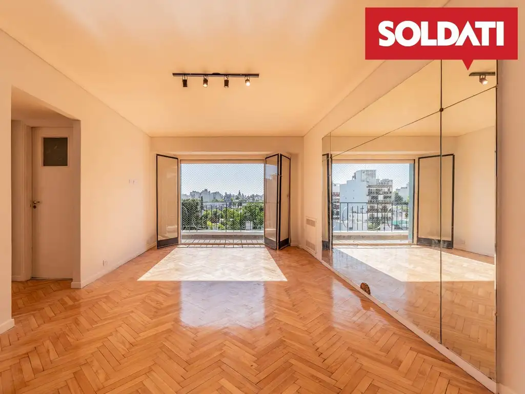 Living comedor muy grande y luminoso con piso de madera, pulido, con vistas al balcón, 2 cuartos amplios con placards, uno de ellos en suite con baño con ducha. El otro cuarto con salida a balcón. Un baño completo.