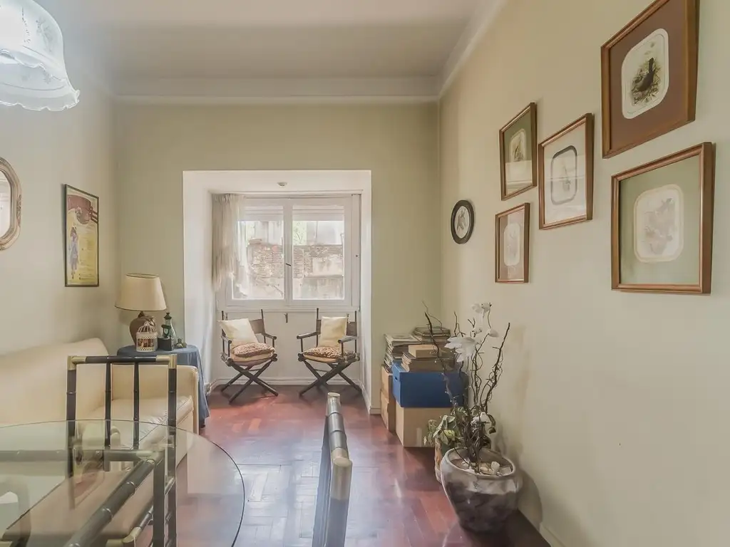 Originalmente es un departamento de 3 ambientes, pero uno de los dormitorios fue convertido en una continuación del living para aprovechar más espacio e iluminación. Entonces actualmente tiene una sóla habitación. Mantiene el pasillo distribuidor que lleva al otro dormitorio y al baño. Según la necesidad, puede volver a su distribución original fácilmente.