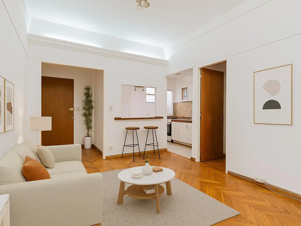 Ingreso principal a cómodo living comedor - Cocina separada con espacio para comedor diario - Pequeña dependencia de servicio o escritorio con baño de servicio o toilette - 2 Dormitorios al contrafrente con vista panorámica a pulmón de manzana - Baño Completo.