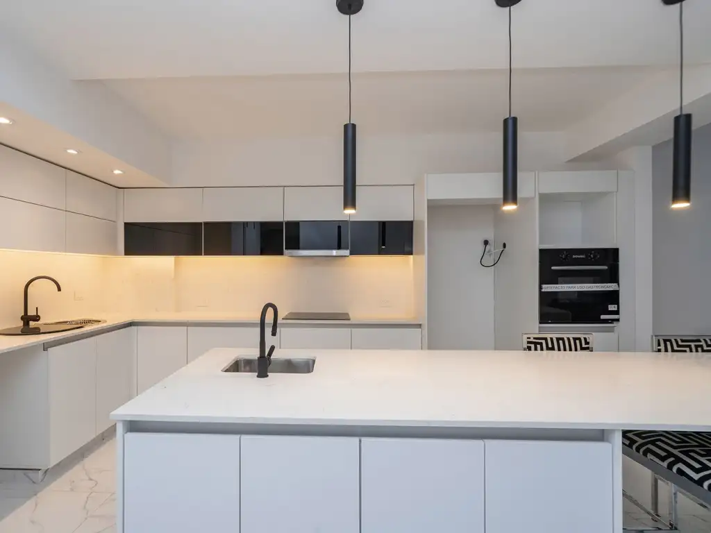 - Amplia cocina con isla y desayunador con diseño exquisito. Isla con gran mesada de silestone blanca, elegante y de mucha calidad. Muebles de bajo y alto de acabado finísimo. Conexión de lavavajilla, horno empotrado DOMEC, anafe ultra moderno DOMEC de cuatro hornallas. Lavadero con puerta granero.