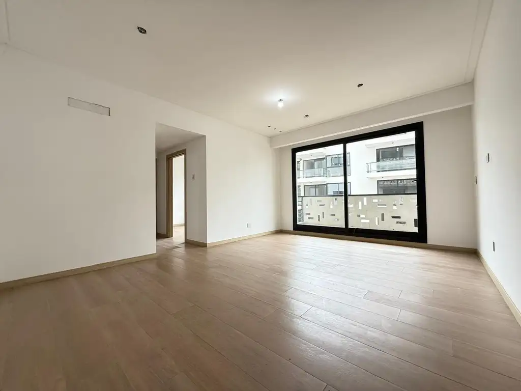 Living comedor con salida a amplio balcón y cocina con barra desayunadora.