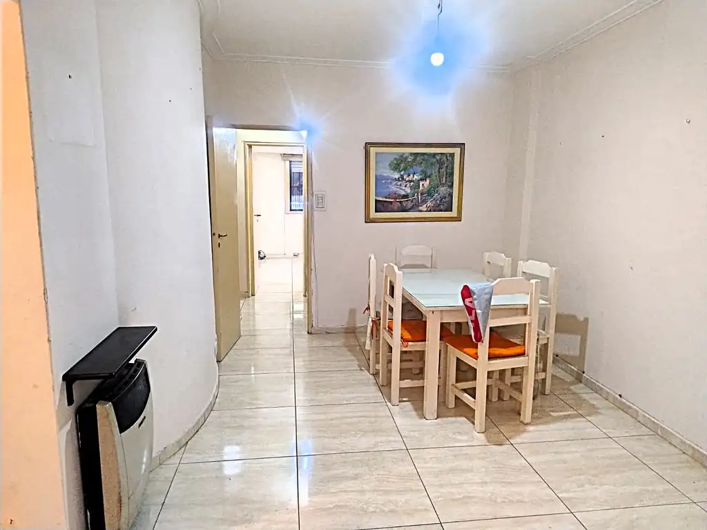 Ingreso por hall distribuidor, acceso a cocina revestida en cerámica, mesada de granito gris, bacha de acero inoxidable y muebles bajo mesada y alacena en melamina, artefacto de cocina con horno y calefón a gas con salida al exterior. Por puerta lateral salida a patio semicubierto con pisos cerámicos, cerramiento de aluminio y lavadero. Living comedor con pisos cerámicos, gran ventana balcón a patio interno, y calefactor instalado. Pasillo de distribución con placard auxiliar; paso a baño completo revestido en cerámicos, artefactos completos y bañera; y dos dormitorios al frente con pisos cerámicos, ventiladores de techo, ventanas enrejadas a la calle, y placards con interiores. Expensas $ 136.000. Venga a verlo, real oportunidad de inversión