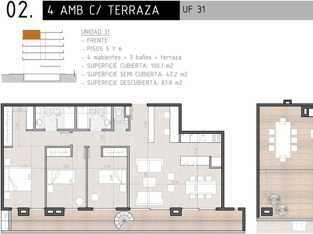 Departamentos en pozo cuatro ambientes con terraza 100 metros cubiertos y 230 descubiertos, al frente en el quinto piso, con parrilla incluida en la terraza.
