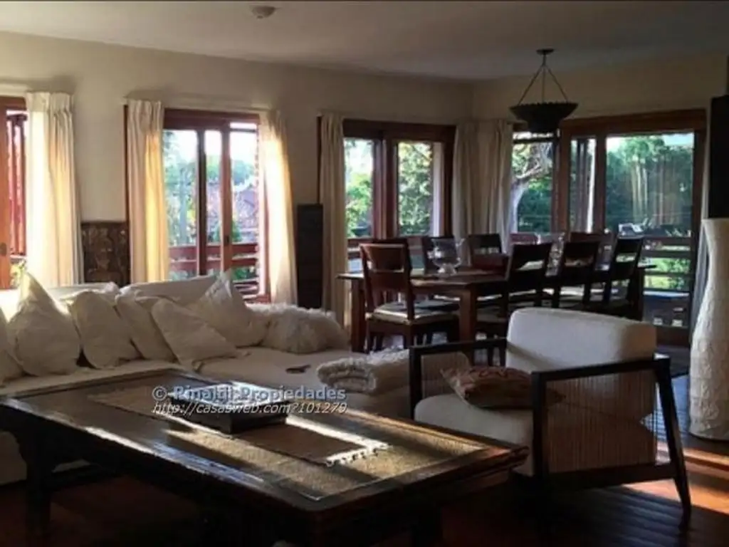 Entrada, lobby particular, puerta principal doble, se abre hacia un amplio living de 60m2 con estufa a leña, vinculado a comedor o estar de 25m2 mediante puerta corrediza de excelente carpintería. Los dos ambientes dan acceso a una amplia terraza orientada al noroeste con vista verde. Desde comedor se accede a gran cocina con isla y espacio para comedor diario. Baño social, de generoso tamaño.