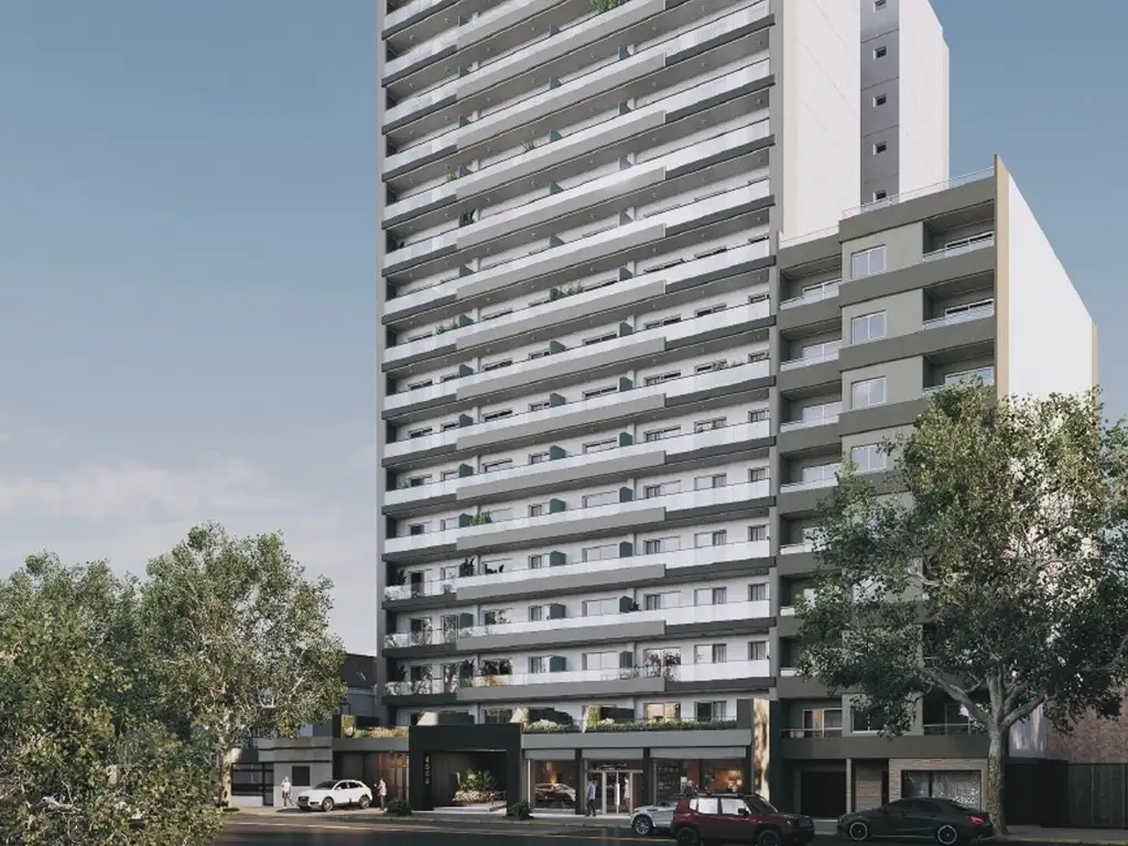 Edificio de 16 pisos con unidades mono, 2 y 3 ambientes, local comercial en planta baja y cocheras disponibles.