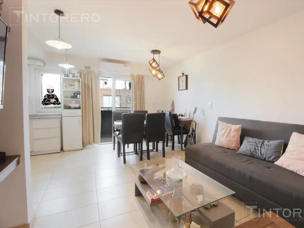 Al ingresar, hacia la izquierda, nos encontramos con un espacio de concepto abierto que integra la cocina con el living-comedor. La cocina está equipada con muebles de alacena y bajo mesada en melamina, optimizando el espacio para almacenar todo lo necesario. El living-comedor es amplio y versátil, ideal para distribuir un sector de estar con sillón y mesa ratona, y otro espacio para el comedor diario. Desde este ambiente, se accede a un cómodo balcón, perfecto para disfrutar del aire libre.
