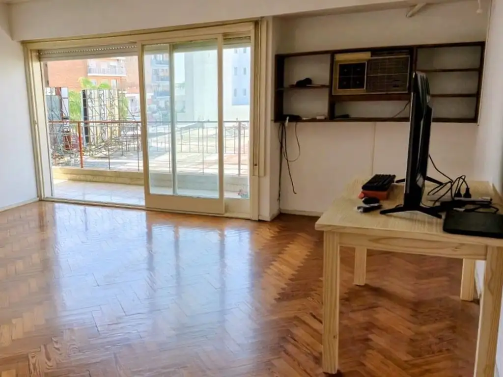 - Departamento al frente (3 ambientes): cocina separada, amplio living comedor, baño completo, dormitorio con placard, pisos de parquet y balcón corrido de 9 metros con orientación norte.