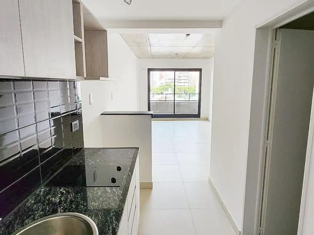 Descripción: departamento de espacio único, muy luminoso, con salida al balcón de orientación Norte. Cocina totalmente equipada, con anafe y termotanque eléctricos, mesada de mármol, muebles bajo mesada y alacena laminados en blanco, espacio para lavarropas y sector heladera. El piso de todo el departamento es de porcelanato. Cuenta con Aire Acondicionado individual.