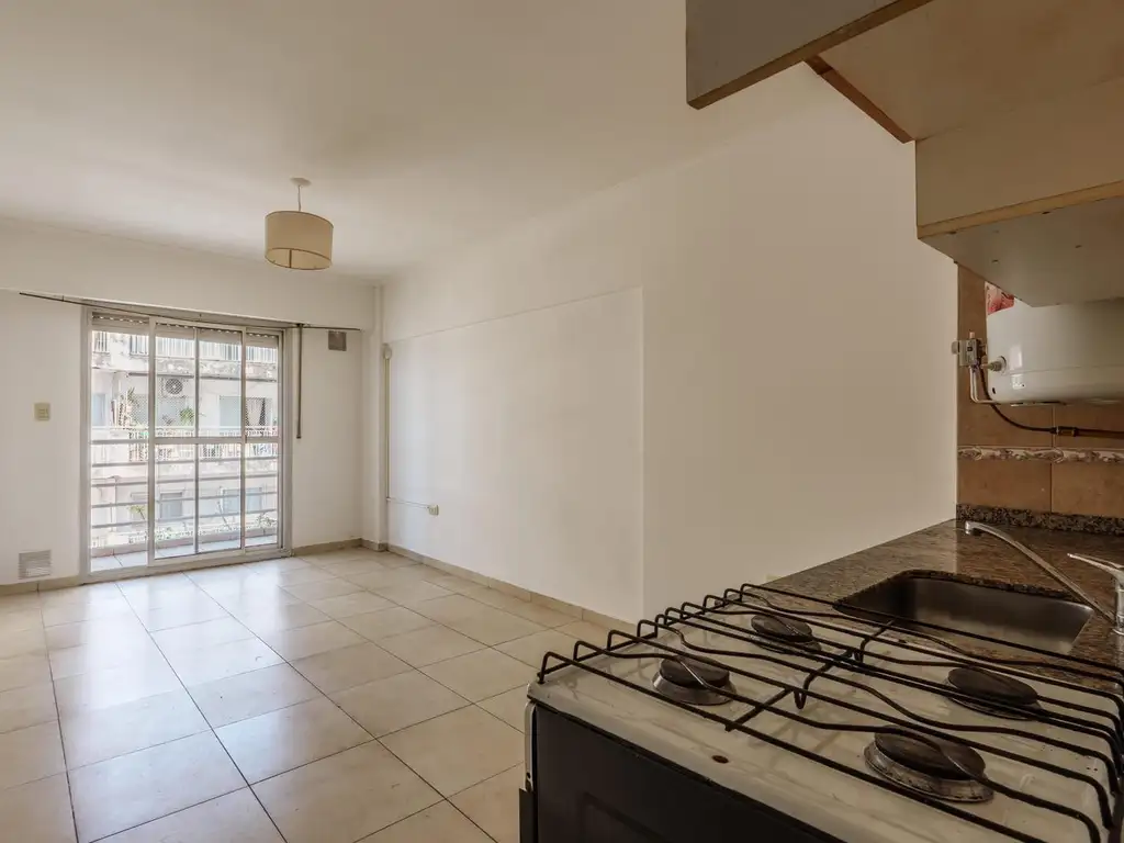 El ambiente principal tiene ingreso directo y se conecta con una cocina integrada con gas natural y amoblamiento de bajo mesada, baño es completo con bañera, y balcón. La unidad está preparada con conexión prevista para lavarropas, agregando practicidad.