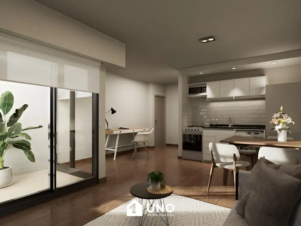Amplia oficina/departamento con patio de 14 m2 y entrega en Noviembre de 2026. Ambiente único, kitchenet, patio y baño completo. Cocheras disponibles.