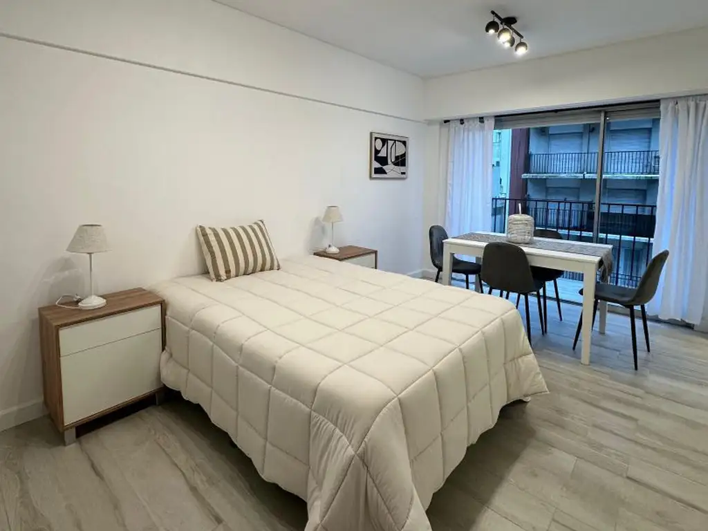 Ambiente a la calle con balcon saliente. Piso porcelanato, placard doble con baulera.