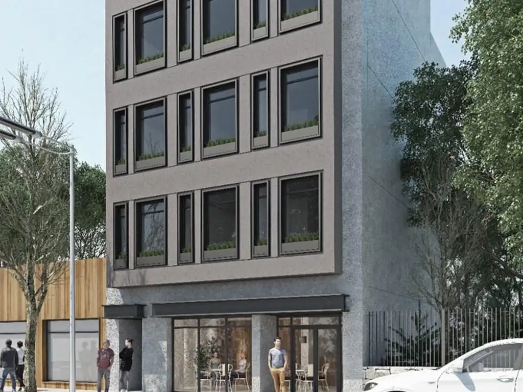 Fachada exterior y relación con el entornoUna paleta moderna de tonos oscuros, aluminio negro, vidrio y vegetación convierte al Genus Brooklyn Design en un enriquecedor elemento sobre la línea de construcción. Al mismo tiempo sostiene una escala amigable a nivel peatón con un local de frente vidriado que descontractura su encuentro con el espacio público.