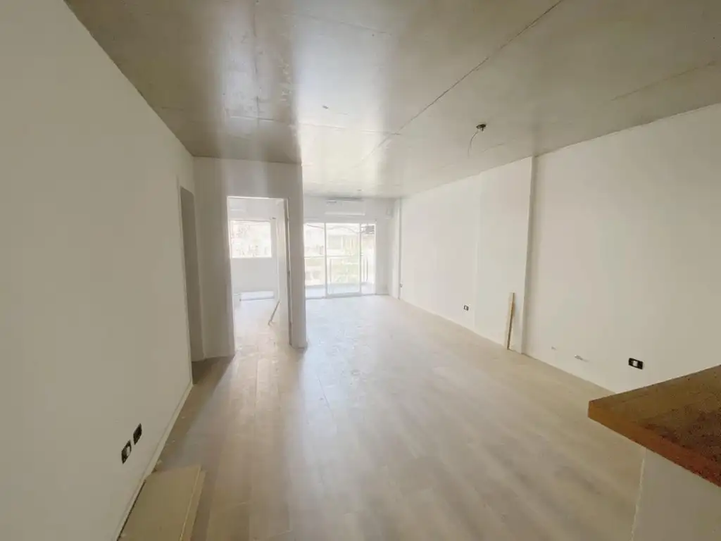 El departamento cuenta con un dormitorio con placard terminado, persianas electricas y salida al balcon, cocina amplia integrada al comedor por una barra, living con salida al balcon, baño completo y patio, son dos departamentos por piso, el edificio es a estrenar (entrega abril 2023)