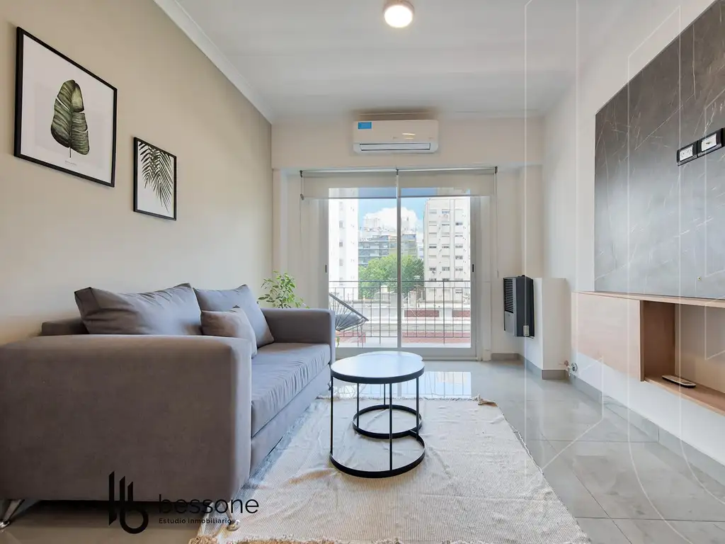 La unidad cuenta con un amplio living-comedor al frente con balcón saliente, cocina separada completamente equipada con electrodomésticos a estrenar (lavarropas y heladera con freezer), y un dormitorio al contrafrente con placard empotrado hecho a medida y pisos de parquet pulidos y plastificados.