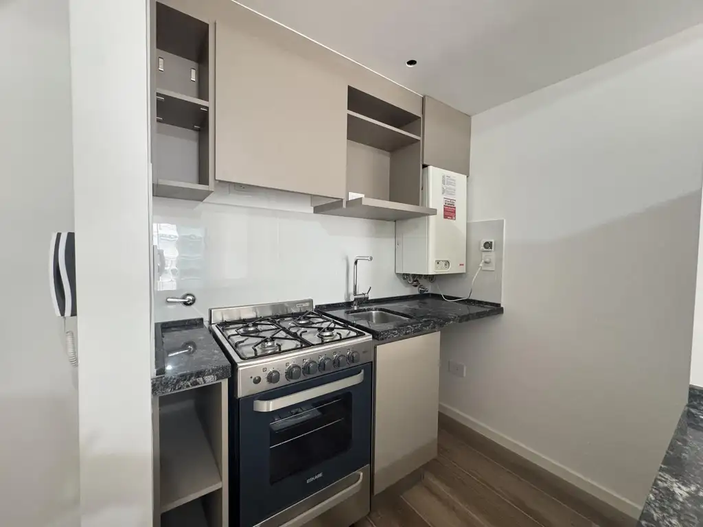 Al ingreso encontramos un ambiente integrado cocina de cómodas dimensiones y totalmente equipada, con muebles bajo mesada y alacena, espacio técnico para lavarropas.