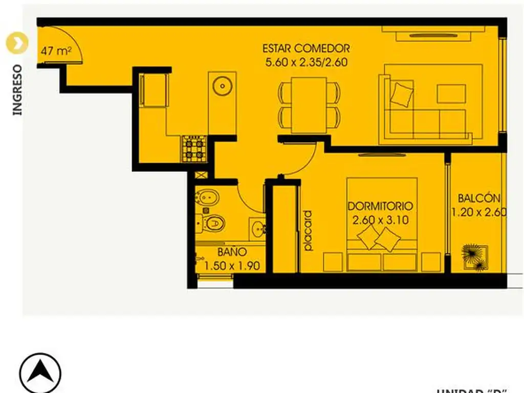 Departamento de un dormitorio, ingreso a luminoso living comedor ventanal al contra frente con cocina integrada y barra desayunadora, dormitorio con placard y salida al balcón con barra, baño completo.