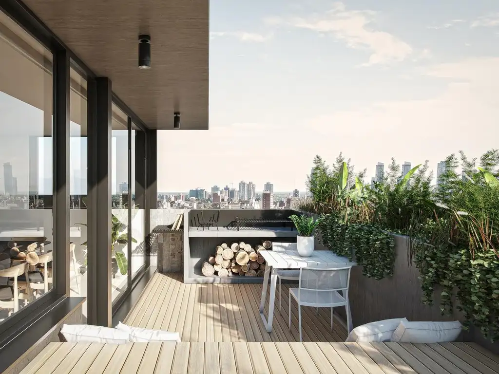 En la terraza del edificio, se podrá disfrutar de una piscina panorámica, un amplio solárium, un quincho semicubierto y un living fogonero. El piso 14 ofrece un rooftop exclusivo, se trata de una terraza con balcón en la parte frontal y trasera, donde se puede disfrutar de una piscina privada y un área de escritorio adicional