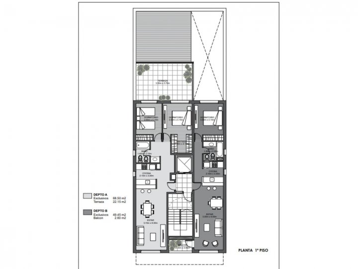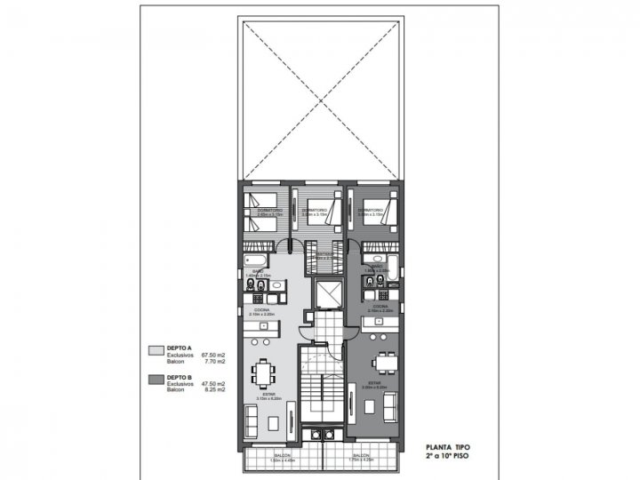 El edificio está compuesto por 10 semipisos de 1 y 2 dormitorios. Todos los departamentos son unidades con ventilación cruzada y amplios balcones al frente, creando así un ambiente contiguo.