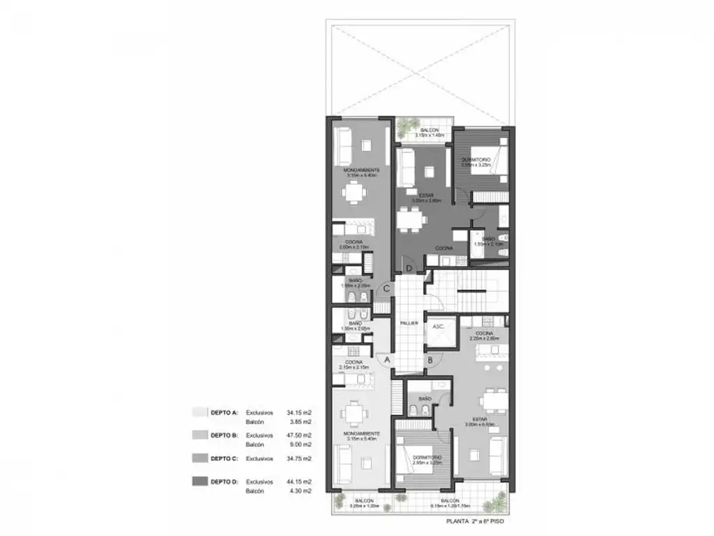 El edificio está compuesto por 12 departamentos de 1 dormitorio y 12 monoambientes. Los balcones, en los departamentos al frente, tienen barandas de aluminio anodizado natural, vidriadas (laminado incoloro 3+3)