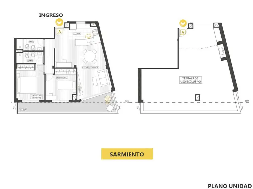 Estar comedor con cocina semi integrada con barra desayunadora. Suite principal con placard y salida a balcón terraza al frente sobre calle Sarmiento. Segunda habitación con acceso al voladizo Oeste y asistida por baño completo. Terraza exclusiva en planta alta.