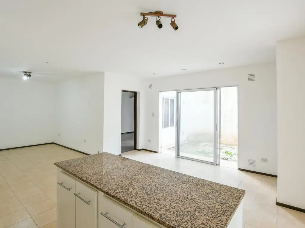 Departamento interno de pasillo (no único) compuesto por ingreso a un amplio living comedor con cocina integrada, dos dormitorios con placares ambos con ventana balcón con salida directa a un patio de uso exclusivo de medidas aproximadas 2 Mts. x 5 Mts., un baño completo, lavadero independiente, muebles de guardado, galería con parrillero, jardín forestado.