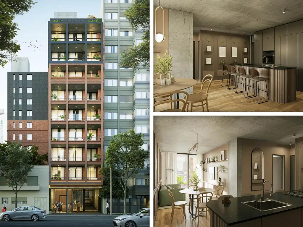 Proyecto: Edificio de planta baja más 9 pisos con unidades de 1, 2 y 3 dormitorios, cocheras en 2 niveles mediante rampa móvil y local comercial en PB. Amenities en azotea con SUM, parrillero y pileta con solárium. Control de acceso y servicio de limpieza. Distribuidor en dos bloques con 2 ascensores independientes.