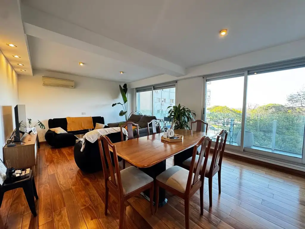 Descripción: Piso exclusivo. Al ingresar nos recibe un living comedor de amplias dimensiones, muy luminoso con salida a un balcón en L al frente con vista al río que tiene una orientación Norte, cocina integrada totalmente equipada con lavadero y un toilette de recepción.