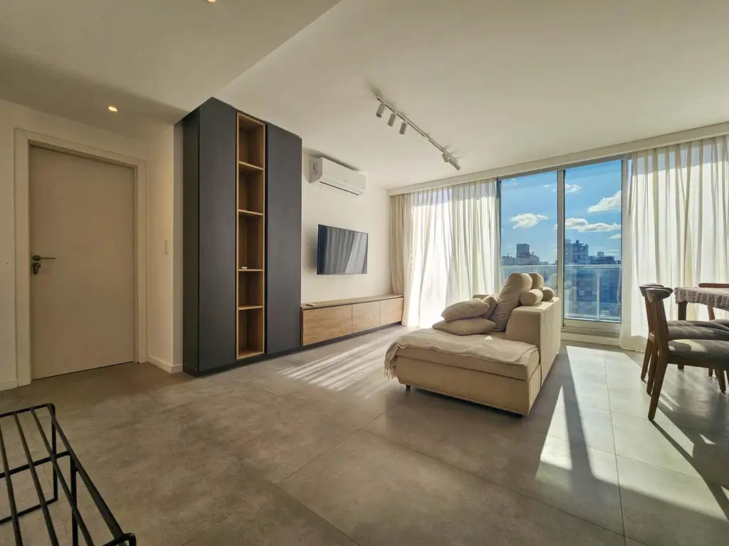Dos dormitorios. Principal en suite con vestidor. Ingreso por sector social abierto hacia el Norte. Cocina integrada en isla equipada con minibar y mobiliario moderno completo. Instalación para lavavajillas y lavarropas. Barra desayunadora. Sector social de living y comedor con salidas al gran balcón con piel de vidrio corrido al frente y visuales abiertas a la ciudad. Paso a los íntimos con ante baño y baño principal con bañera. Dormitorio con salida hacia el balcón y placares completos. Unidad equipada con mobiliario de diseño personalizado.