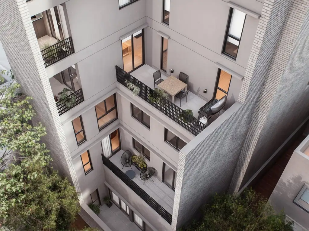 Proyecto compuesto por planta baja con oficina y una cochera, y 8 pisos con unidades semipiso de 1 y 2 dormitorios.