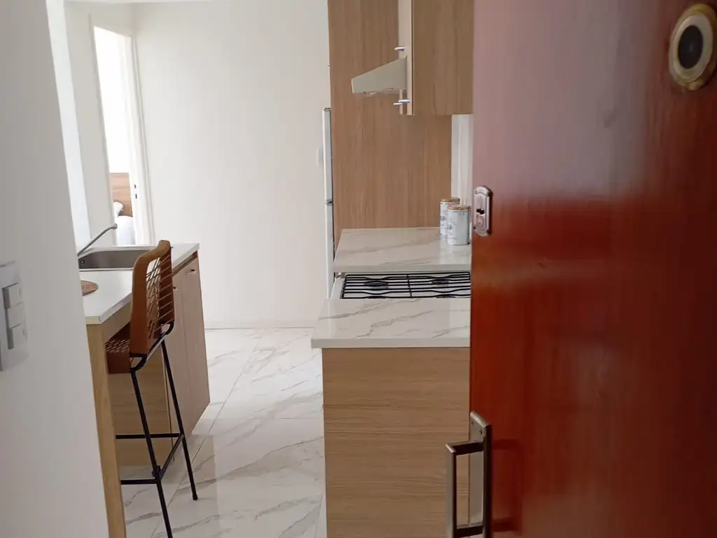 Se accede a un living con la cocina integrada, muy luminoso porque las carpinterías tienen una doble altura vidriada hacia el exterior, con una ventana y una puerta de abrir para acceder al balcón corrido que va desde todo el living hasta el dormitorio incluido, que también tiene el mismo sistema de acceso al balcón.